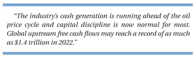 - Global upstream free cash flows may reach a record of as much as $1.4 trillion in 2022.