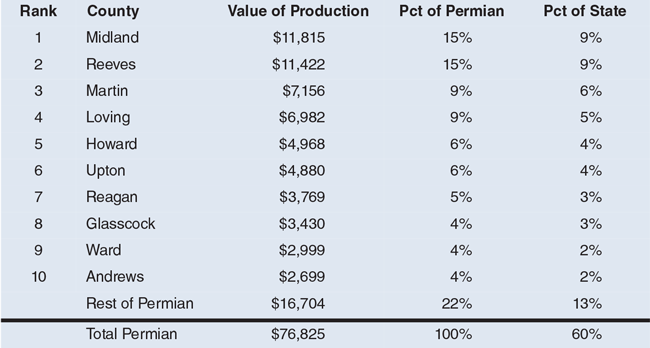 Texas Top Producing Permian Basin Counties, 2019 Value of Production, Millions of Dollars