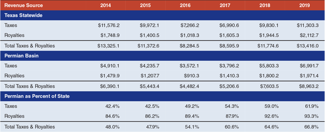 Moreover, the analysis adds, in 2014, $6.4 billion, or 48% of that industry-based revenue, originated from the Permian; whereas in 2019, the Permian Basin accounted for $9.0 billion, or 67%, of Texas oil and gas taxes and royalties (Table 2), a sum equal to $312 for every Texan.