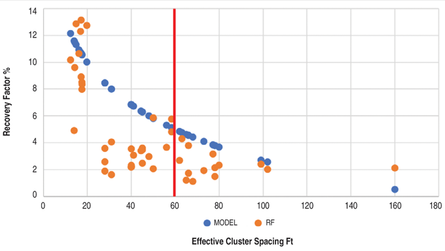 Figure 1 shows a comparison of recovery factor versus cluster spacing from comparisons between EUR and oil in place (OIP) using a model developed by researchers at the University of Texas at Austin’s University Lands (UL) group (see SPE 199721 “Effective Cluster Spacing Plays the Vital Role in Unconventional Reservoir Development: Permian Basin Case Studies,” by Hongjie Xiong, presented at the 2020 Hydraulic Fracturing Technology Conference & Exhibition). The blue dots are the results of UL’s simulation model and the orange dots are estimated from a comparison of OIP with EURs.