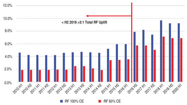 The UL model assumed 100% cluster efficiency. However, prior to the advent of XLE in 2018, very few wells had high cluster efficiencies. Several studies have suggested that poorly diverted completions have ±60% cluster efficiencies. Figure 2 shows the results when the 100% cluster efficiency model and the 60% cluster efficiency model are applied to the historical cluster spacings for 802 Eagle Ford wells with cluster spacing data. The expected total recovery factor is in the 4% range until after the second half of 2016. With a ±14% expected total recovery factor, this suggests that the total recovery factor can be increased with refracs by at least a factor of three for wells completed prior to the second half of 2016.