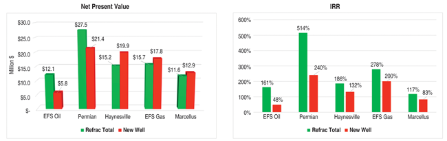 With the ongoing competition for completion dollars between existing well refracs and new-well completions, an economic comparison is in order. As shown in Figure 3, the rates of return are superior for refracs in the Permian, Marcellus, Haynesville and both the Eagle Ford oil and gas windows (the Woodford was not included in this part of the analysis). On a net present value basis, Eagle Ford and Permian refracs of wells with primary-infill issues have higher NPV10s than new wells. In the other areas with refrac NPVs less than new wells, the best practices bar was not raised very high with the actual refracs used for the economic analysis.