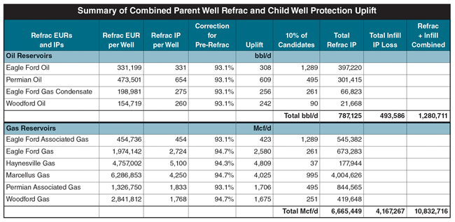 A comparison was made between the last full month’s production prior to refrac and the normalized first month’s post-refrac production. The average reduction of the post-refrac first month’s production was 6% to subtract the last month’s production prior to the refrac since that production will be taken off line once a refrac is completed. This multiplier then can be used for the Permian, Marcellus and Woodford, which do not yet have significant refrac activity.