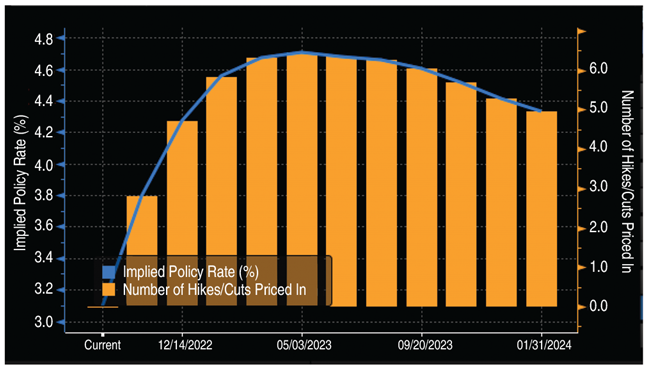 Economic growth has slowed more than estimated and the equity markets continue to struggle, with the broader S&P index down 24% year to date. Figure 1 shows the implied policy rate, which currently peaks in May 2023 at slightly over 4.6%. The elevated rates are expected to persist well into 2025. Given the FOMC’s guidance for higher rates over the next four years, we are barely in the second inning of this game.
