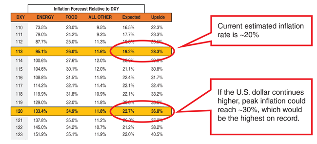 NOTE: Peak inflation estimates are contingent on the level of DXY and have an estimated three-six-month lag time. Current estimated peak inflation of ~20% should filter through in early 2023.