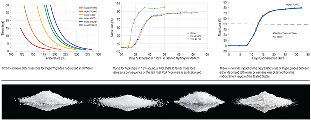 Polylactic acid (PLA) is one of the most popular base materials for degradable diverters. Manufacturer NatureWorks attributes PLA’s success to how well its degradation rate can be tuned for different temperatures and applications (top), as well as the variety of forms it can take (bottom).