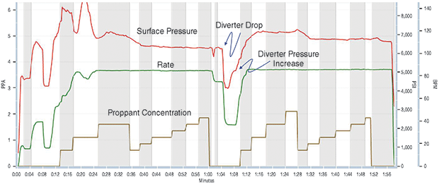 This pressure spike is easy to spot even when the operator is sending the diverter down with proppant, Psihogios assures. “Our material is unique in that it binds to the sand and helps it move to the fracture. This means operators can pump at 90-100 barrels a minute, and still get diversion pressure,” she says.