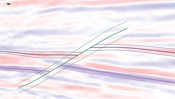 Measuring a best estimate (bold lines) and interpretation uncertainty (envelope) for faults and horizons enables geoscientists to estimate variability below the resolution of seismic data.