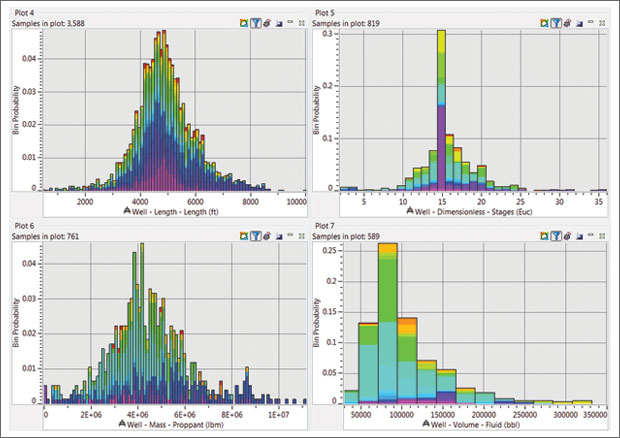 Figure 1 shows the range of well lengths, number of fracture stages, proppant and fluid used for wells in the Eagle Ford play. The histogram counts are colored to illustrate different Eagle Ford operators, highlighting a wide diversity of engineering approaches.