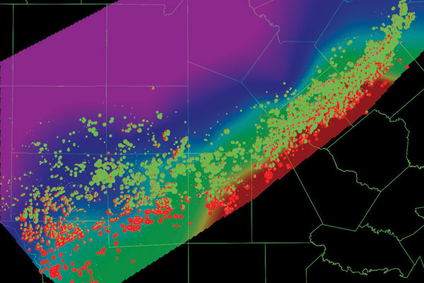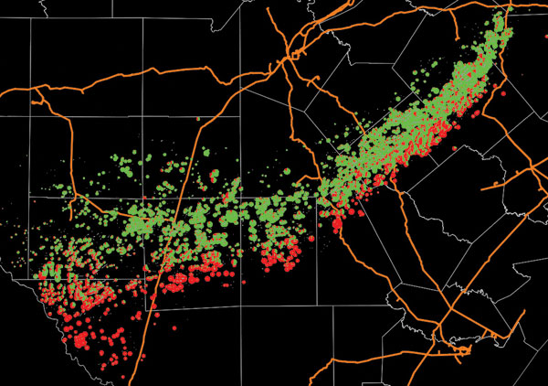 A recent study has accessed a wealth of public oil and gas data for the Eagle Ford play from the Texas Railroad Commission. Mapping initial well production rates across the play illustrates the range of performance and the transition from natural gas to oil production across the Eagle Ford trend, as shown in Figure 2. In this map of initial well production, red denotes natural gas and green denotes condensates and oil.