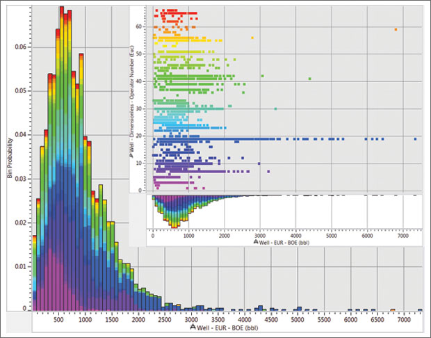 Converting natural gas production to barrels of oil equivalent provides a basinwide perspective of relative well performance. Figure 3 shows the production variability for a regional sampling of Eagle Ford wells, colored by operating company, with initial oil, gas and liquids production converted to boe. Mean daily initial well production is 886 boe, and maximum production is approximately 7,300 boe. The inset image of Figure 3 illustrates the variability in well production for all Eagle Ford operators, leading to the question of whether well engineering or location is more important.