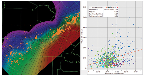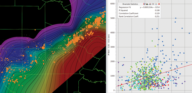 These statistical perspectives illustrate the variable impact of completion size on production, with a moderate level of correlation (»0.366), but a large regional variation. In particular, the big producing wells to the northeast (in Karnes and Gonzales counties) respond best to proppant levels. This amplifies the question of whether well performance is driven more by engineering drilling and completions or location (i.e., geology).
