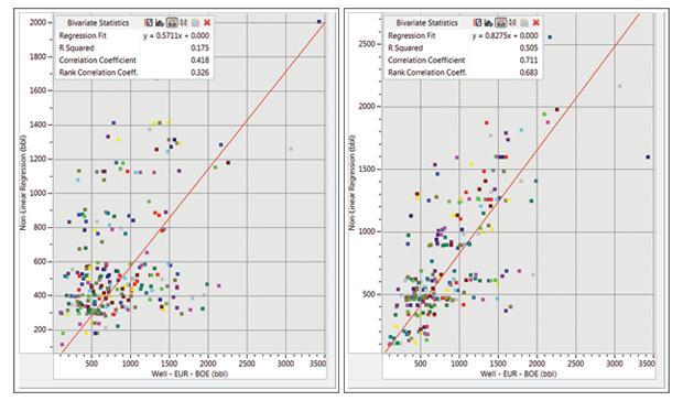 Figure 5 shows nonlinear production predictions based on engineering data only at left and engineering and geologic data (including depth and thickness) at right. More accurate predictions and less uncertainty are attained with a balanced engineering and geologic model.