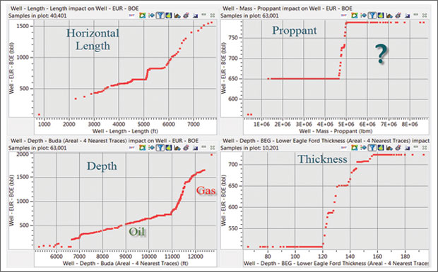 In the Eagle Ford, analytics reveal that well depth is one of the largest drivers of well production–directly related to the lightness of the petroleum (i.e., more likely dry gas or condensate) and pressure. From an engineering perspective, horizontal well length, number of fracture stages, amount of fluid and, yes, proppant volumes are among the important determinants of well production.