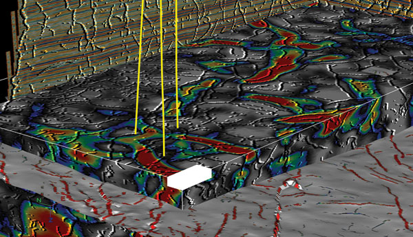 Figure 7 illustrates the application of a threshold set to a fault probability volume, which is then used to estimate well bore proximity to the nearest fault. Color intensity indicates the distance to the nearest likely fault. The nearest or average distance to a likely fault is then extracted to each well bore intersecting the seismic volume. For this study, seismic data provided by Global Geophysical provided detailed insights into geologic influences in McMullen and LaSalle counties.