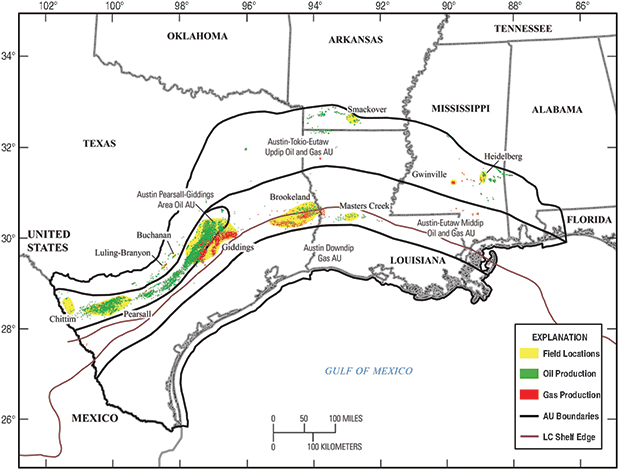 According to a newly revised U.S. Geological Survey assessment, undiscovered and technically recoverable Eagle Ford resources are pegged at 8.5 billion barrels of oil, 66 trillion cubic feet of natural gas, and 1.9 billion barrels of natural gas liquids. It has been a while since USGS assessed the Austin Chalk, but it has estimated 900 million barrels of oil in only the Giddings Field, the play’s largest field, spanning parts of seven counties in South-Central Texas, which already has produced 526 million barrels of oil and 4.7 Tcf of gas.