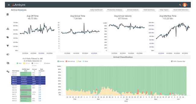Production teams that use domain-specific AI to continuously optimize their artificial lift systems see several benefits, including higher production, less strain on equipment and earlier warnings about potential issues, Ambyint reports. For plunger lift, the production increase typically ranges from 3% to 7%. This screenshot shows arrival analytics for several plunger lift wells for which AI is managing set points.