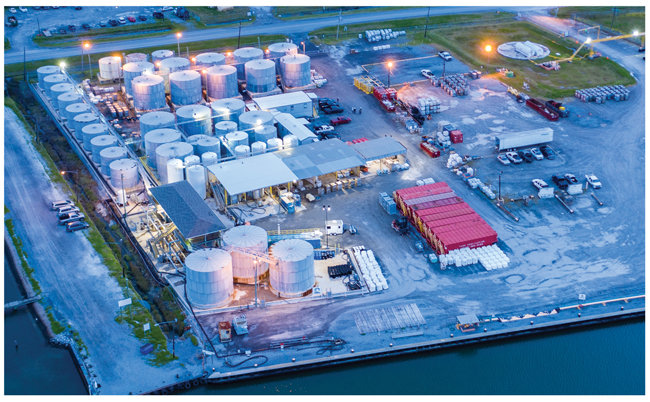 This TETRA Technologies Inc. facility in Port Fourchon, La., delivers clear brine fluids, specialty fluid blends and chemical additives, as well as lube oils and drilling fluids. The company says it is improving its manufacturing processes and pushing the envelope on which fluids can be reclaimed as part of a broader effort to help operators reduce costs.