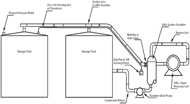 When VRUs are used to recover vapors from storage tanks, the vent line from the storage tank, or the common manifold suction line for multiple storage tanks, should be piped to the suction scrubber on the VRU. The suction scrubber is a two-phase separator that removes some of the free oil in the vent gas. The recovered oil is pumped back to the storage tank, and the gas from the suction scrubber flows to the VRU for compression. The discharge piping from the VRU can be routed to the gas gathering line, a meter run, or the suction of a gas compressor.