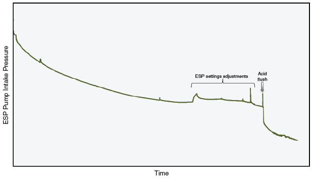 After attempts to improve drawdown by adjusting ESP settings were unsuccessful, an acid flush was performed, resulting in increased drawdown. Production tests performed during the week before and the week after the acid flush revealed average rate increases from 460 to 1,125 barrels of fluid per day.