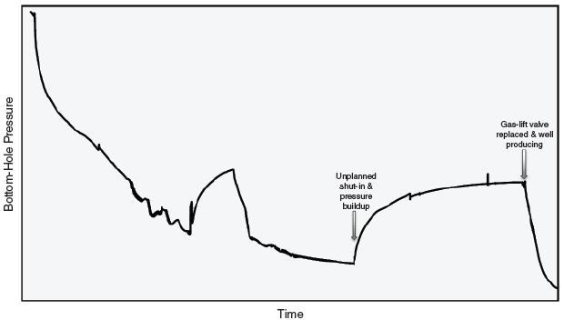 Bottom-hole pressure, as a unique diagnostic measurement, was the only reason to pull equipment out of the well and search for an issue. After pulling the tubing, a shallow gas-lift injection valve failure was discovered. The valve was replaced and the well was reopened, producing an average 800 bbl/d of fluids during the first week.