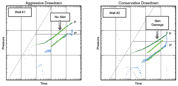 Because of operational issues, both wells were shut in and BHP was monitored during extended pressure buildups. Log-log plots of pressure and pressure derivative versus time revealed that well No. 2 (with managed drawdown) had interpreted skin damage, as indicated by the increased separation between the pressure and pressure derivative curves, compared with well No. 1.