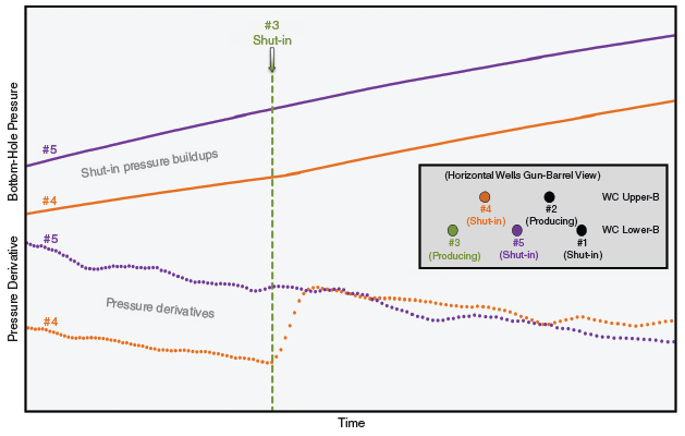 The observed time-zero connectivity may or may not degrade with time, as demonstrated in Figure 4B, using three wells from the example shown in Figure 4A. An additional interference test was conducted four months after time-zero connectivity was observed. Well Nos. 4 and 5 were shut in, BHP was monitored during pressure buildups, and surrounding wells were kept producing. After extended and stable pressure buildups were observed, well No. 3 was shut in also. Well 4 responded immediately with a more rapid pressure buildup and a step change increase in pressure derivative, indicating sustained connectivity with well 3.