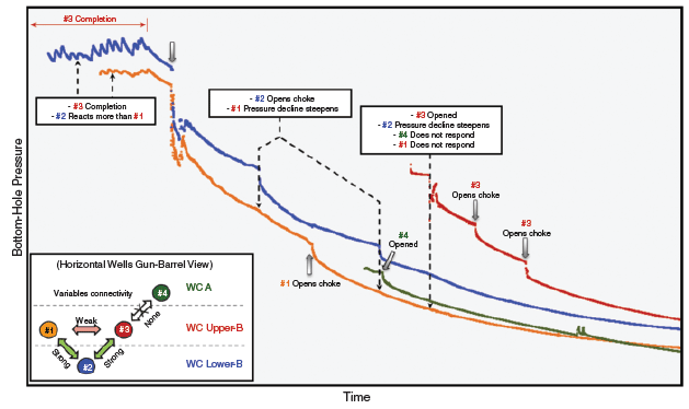 Figure 4A illustrates how measured BHP and interference tests can be used to quantify magnitude and direction of “time-zero” well connectivity (or the connectivity observed between wells during initial flowback). In this case, the shut-in BHP response from well No. 5 is shown as four surrounding wells are opened. Pressure begins to decline as soon as well No. 1 is opened, indicating connectivity with the offset well. The pressure decline steepens as well No. 2 is opened, again during well 1 and 2 choke changes, and again when wells 3 and 4 are opened.