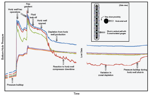 The multigauge assembly was installed while an offset horizontal well was being drilled in very close proximity to the vertical well. The corresponding pressure buildup is shown in the bottom left of Figure 6.