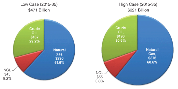 In both scenarios, 70 percent of new wells are expected to be oil and 30 percent gas, but more than 820,000 new wells would be completed by 2035 in the high case compared with 682,000 in the low case. The high case projects natural gas production increasing 1.8 percent annually (topping 130 billion cubic feet a day by 2035), with natural gas liquids production tracking gas output to grow from 4.2 million to 6.5 million barrels a day during the 20-year period. This compares with 110 Bcf/d and 5.7 million bbl/d, respectively, for the low case.
