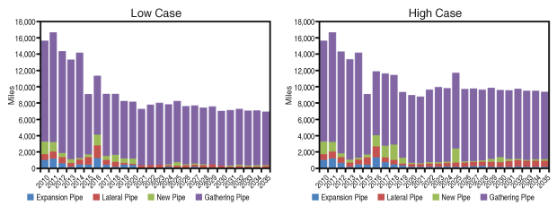 Figure 3 compares miles of new gas gathering (purple) and transmission (blue, red and green) pipeline added in both the high and low cases. The high case is projected to add an average of 8,500 miles of new gathering lines and 1,400 miles of new transmission lines each year through 2035, while the low case adds 7,100 miles of gathering lines and 850 miles of transmission lines each year.