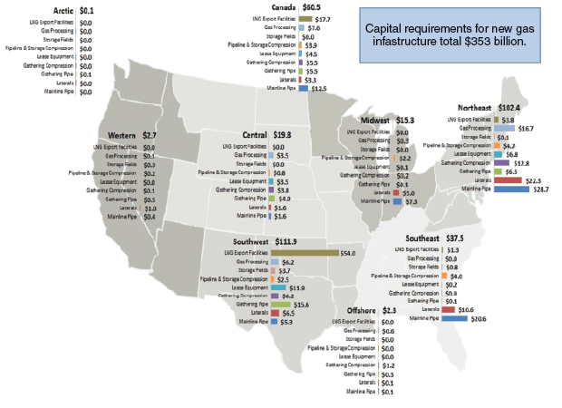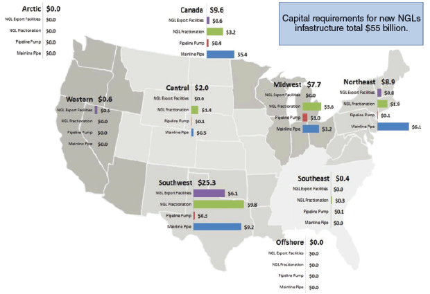 Additional large expenditures in the Northeast ($8.9 billion) and Midwest ($7.7 billion) would be derived from high NGL production growth from the Northeast, requiring substantial new pipeline and pumping capability to transport liquids produced from the Marcellus/Utica for fractionation in the Gulf Coast.