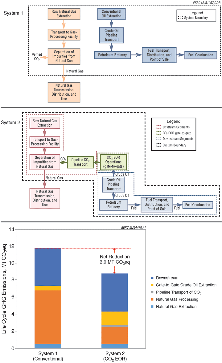 In addition, estimates used for associated CO2 storage incorporated both operational data from the Bell Creek project and from numerical simulation models calibrated to known performance data. As seen in Figure 3, the analysis compared GHG emissions for a base-line conventional system (System 1) against a system with incremental oil produced through CO2 EOR using CO2 captured from a natural gas processing facility (System 2).