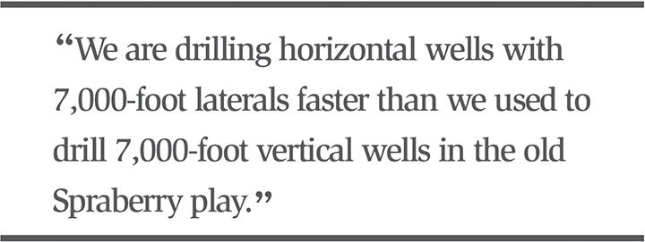 “A guy sits in a cubicle like an office and operates a rig with a joystick like a computer game,” says Castle. “You have to be literate at computers. The roughnecks are still rough, but the industry is changing. We are drilling horizontal wells with 7,000-foot laterals faster than we used to drill 7,000-foot vertical wells in the old Spraberry play.”