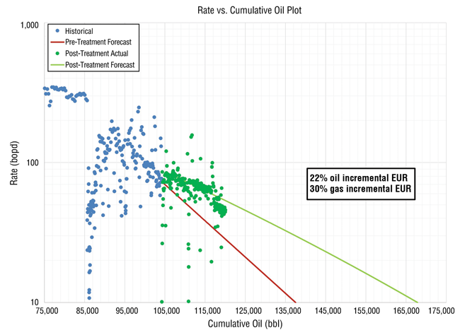 According to Lantz, many wells can benefit from Kairos Energy Services’ treatments. “For mature unconventional wells, we focus on ones performing below expectations,” he says. “We analyze those wells to look for signs of specific problems, such as changes in the rate transient analysis indicating damage, unusually high water cuts or rapid changes in the gas-to-oil ratio, all of which can indicate water block or other addressable damage.”