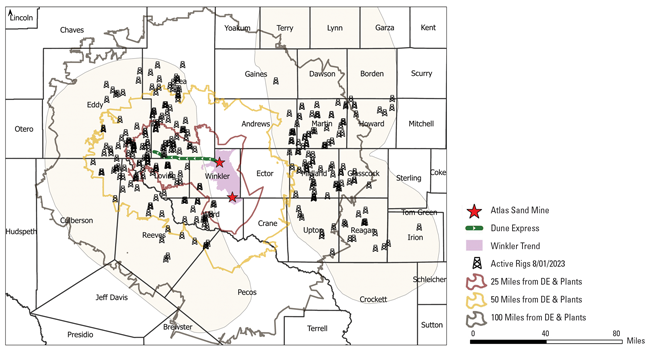 In addition to permanent load-out facilities at the Texas-New Mexico border and the conveyor’s end, Turner says Atlas will be able to pick up sand at any point along the belt. “By building the Dune Express, we are essentially moving our sand plant from Kermit into the middle of the Delaware Basin, much closer to where the sand is used,” he says. “On average, we think we will be able to reduce the number of miles driven on public roads by 70%.”