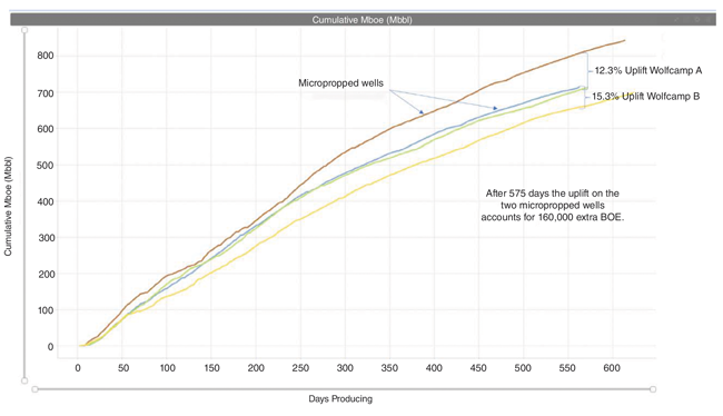 How long the extra production takes to manifest can vary, Montgomery notes. An operator targeting Wolfcamp wells in the Midland Basin sees it in a month, but in other areas or formations, it may take three-six months. “In one case, the benefit did not appear for more than a year, but the wells with microproppant produced 81% more after three years,” he relates. “The microproppant has a compressive strength of 60,000 psi, so it can keep fractures open for a long time.”
