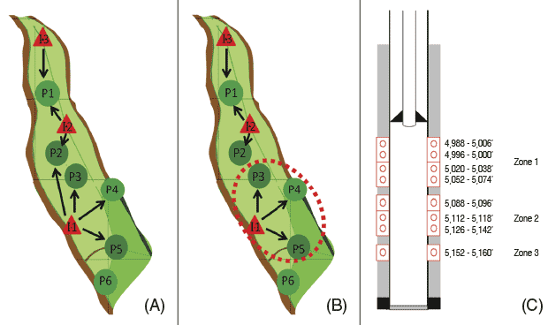 The confined nine-well pattern chosen for the pilot is shown in panel A in Figure 1. The pattern is limited by two faults trending northwest-to-southeast. As indicated by the arrows, in addition to injector I1, producers P1 and P2 are closely connected with the I2 and I3 injectors. A refined four-well pattern that excluded the P1 and P2 wells was defined for the pilot (panel B). The P3, P4 and P5 producers were expected to be mainly impacted injection in I1, although P3 did get some of the CO2 injected in I2. The P4 and P5 wells, which were shut-in for most of the time because of their high producing GORs, were re-opened about two months before the pilot commenced.
