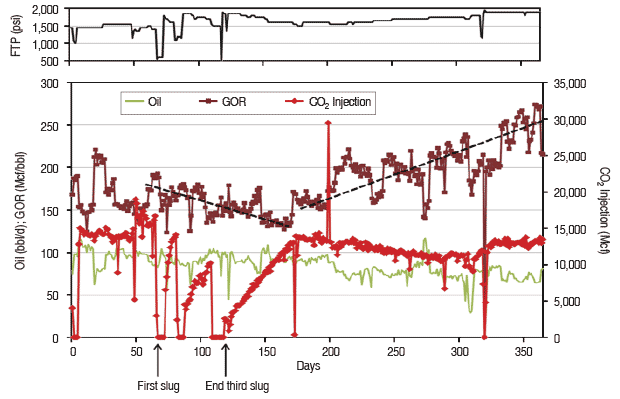Because the pilot targeted conformance rather than in-depth mobility control, a relatively low foam volume (1 percent of the pattern’s pore volume) was injected. The treatment was applied as three alternating slugs of aqueous foaming solution and CO2 over a period of four months.