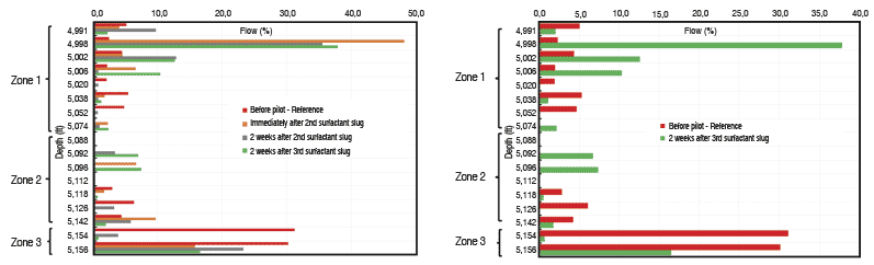 Three injection logs were acquired in injector I1 during the pilot. They are plotted at the left-hand side of Figure 3 along with the reference log acquired just before the first surfactant slug (shown in red). The logs show that flow was already reduced in the bottom of zone 3 and increased in zone 1 right after injecting the second surfactant slug (grey). The opening of new paths in zone 2 also was observed after injecting the third slug (green). At right in Figure 3 is the reference log acquired before starting the pilot versus the final log after injecting the third slug. Diversion from zone 3 to zone 1, and the opening of paths in zone 2 after foam injection, are clearly visible, as indicated by changes between the two injection profile logs.