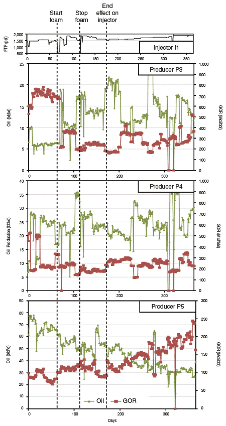 Figure 4 shows data for the three producing wells in the pattern from before the first surfactant slug injection (“start foam”) to the end of the third slug (“stop foam”) and the end of the foam’s effect on injector I1 (“end of effect”).