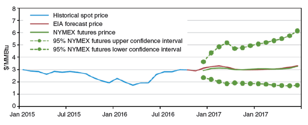 According to the agency, growing domestic consumption, higher pipeline exports to Mexico and increasing liquefied natural gas exports to overseas markets will help boost Henry Hub spot prices from a 2016 average of $2.50 an MMBtu to $3.12/MMBtu in 2017, with the high end of the forecast at $4.84/MMBtu. Figure 1 shows actual and projected Henry Hub prices from January 2015 through July 2017. The confidence intervals are derived from options market information for the five trading days ending Nov. 3.