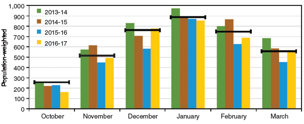Figure 2 shows projected winter 2016-17 heating degree days based on NOAA forecast data and referenced to recent heating seasons. The horizontal lines indicate each month’s prior 10-year average. With nearly half of all U.S. households heated primarily with natural gas, EIA’s Winter Fuels Outlook predicts that residential gas prices will average 11 percent more than last winter at $10.37 an Mcf, which would be the highest since the winter of 2010-11.