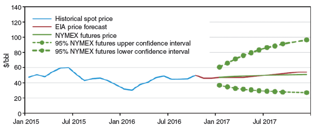 Looking at the larger U.S. oil market picture, EIA’s analysis forecasts West Texas Intermediate prices averaging $50/bbl in 2017. Figure 3 shows actual and projected WTI prices from January 2015 through July 2017, with confidence intervals derived from options market data for the five trading days ending Nov. 3.