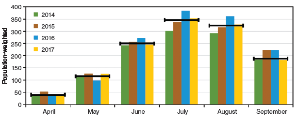 Among U.S. households, 39 percent rely on electricity as the primary heating source, including 63 percent of all households in the South. EIA notes that power generation fueled by natural gas reached record levels last summer, and for the first six months of 2016, natural gas supplied 36 percent of total U.S. electricity generation versus 31 percent for coal. Figure 4 shows projected summer 2017 cooling degree days based on NOAA forecast data. The horizontal lines again indicate each month’s prior 10-year average.