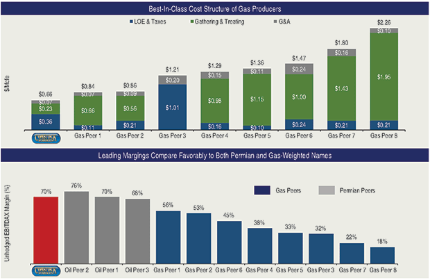 That lean cost structure combines with ready access to the Henry Hub and other premium natural gas markets to provide Comstock’s strong margins, Allison reports. “Our EBITDAX (earnings before interest, taxes, depreciation/depletion, amortization, and exploration expenses) margin is 70%,” he says. “That allows us to compare favorably not only with the other gas-weighted public companies, but also with the best Permian Basin producers.”
