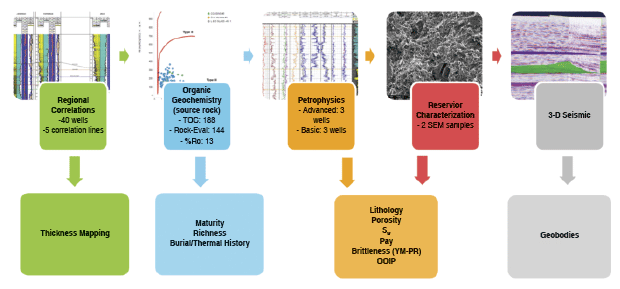 The objective was to better understand if a viable and economic Wolfcamp play could be extended onto the Eastern Shelf environment. It was essential to investigate and define the presence of the main petroleum system play elements–namely source rock quality and potential, reservoir thickness and quality, and ultimately, the presence of contained hydrocarbons.