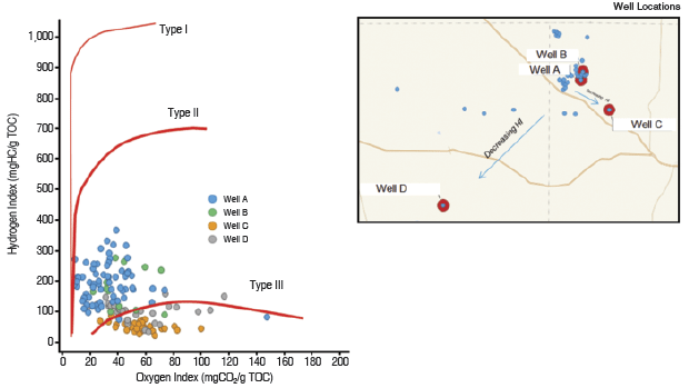 Overall, the organic properties of the entire Wolfcamp formation at each well location showed poor to fair hydrocarbon generation ability because of low kerogen quality and maturity levels. The recorded TOC values ranged from 0.43 to 3.17 weight percent (wt%), with the Wolfcamp A averaging 1.27, the Wolfcamp B averaging 1.25 and the Wolfcamp D averaging 1.35 wt%. The remaining hydrocarbon potential and hydrogen index (HI) values indicate a decrease from the north to the south (Figure 2).