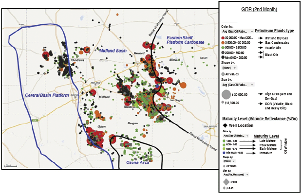Testing this hypothesis further, an evaluation was performed of the gas-to-oil ratios from hydrocarbons produced from the Wolfcamp across the Midland Basin. This regional information was incorporated with the results obtained from the source rock properties collected within the study wells to create a GOR trend map of the basin. As depicted in Figure 3, the map shows higher GOR variabilities for hydrocarbons produced from the Wolfcamp across the basin, ranging from black oil to wet and dry gas. Within the study area, a trend of mixed hydrocarbons of varying GOR was observed, with most corresponding to volatile oil to wet gas and dry gas on the flanks of the Eastern Shelf.