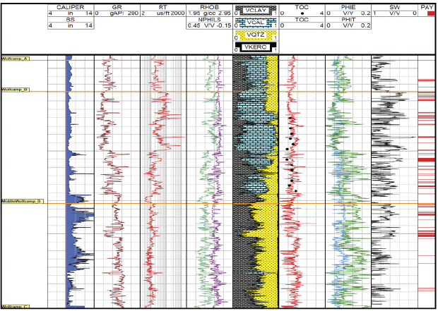 The petrophysical results highlighted that the Wolfcamp A and B host higher carbonate content, compared with the Wolfcamp Middle B, C and D, which host increased clay and quartz volumes replacing carbonate volumes. The recorded kerogen volume is reasonably constant throughout the entire Wolfcamp formation, with some thin, higher kerogen value intervals toward the top of the Wolfcamp B. Calculated effective porosity (PHIE) varies from 0 to 10 percent throughout the Wolfcamp.
